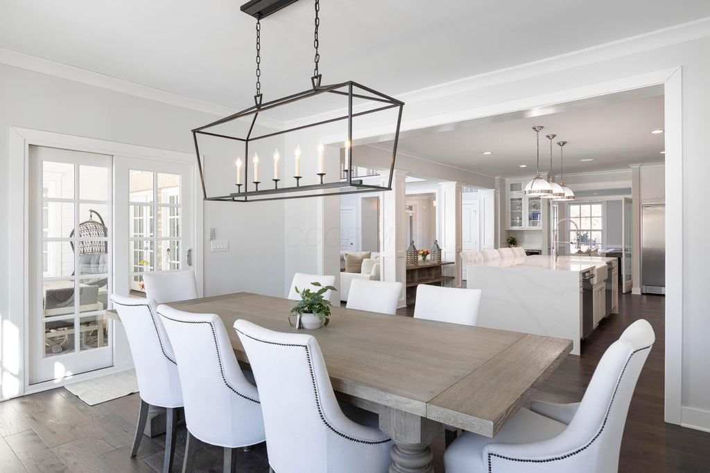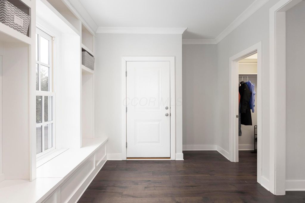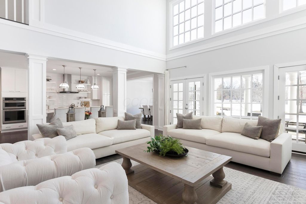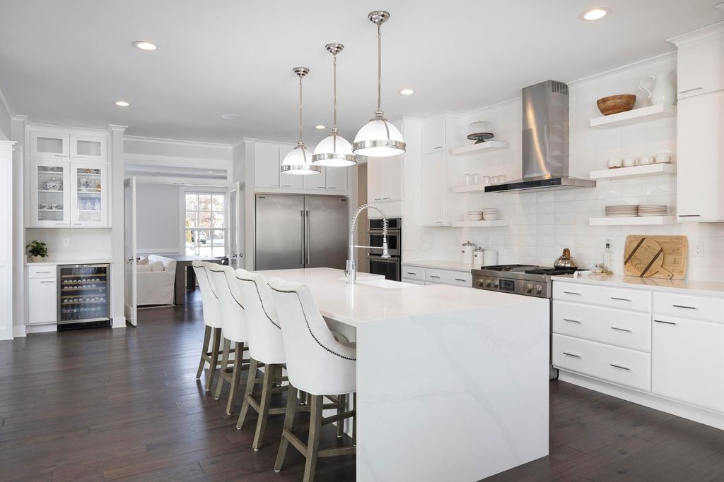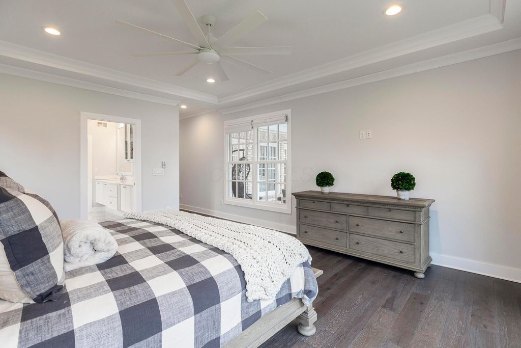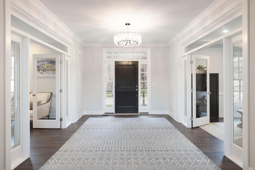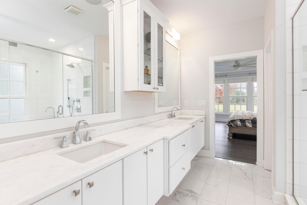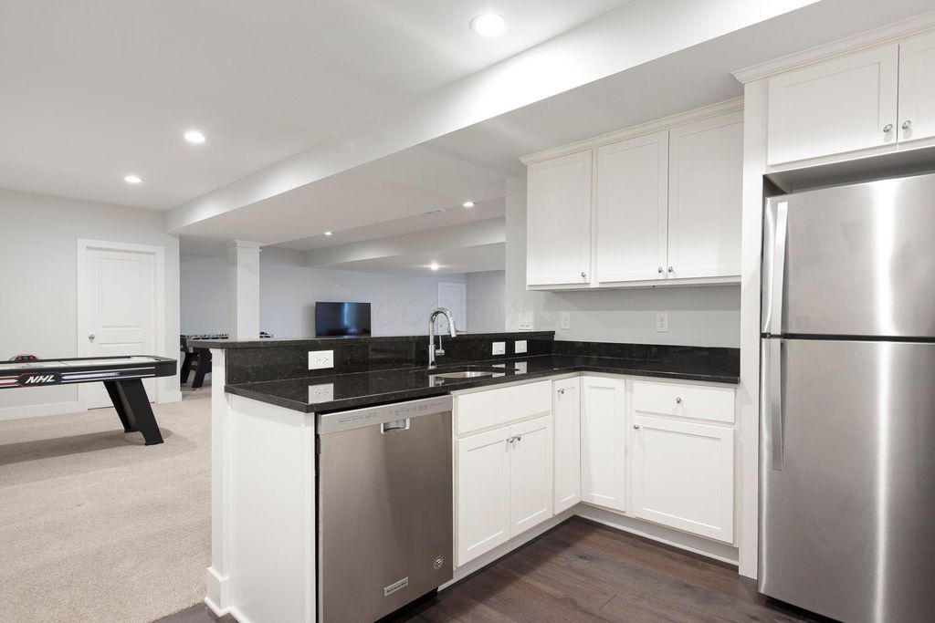 Overlooking the 7th fairway of New Albany Country Club in Ebrington, this 6,558 square foot California inspired home offers six bedrooms and six and a half baths across three levels of finely appointed living space. The foyer opens to two home offices, one with a gas fireplace, leading to a great room with soaring ceilings, a second fireplace, and expansive windows framing sweeping golf course views. Hardwood floors flow throughout the main level. The gourmet kitchen features a custom granite waterfall island with bar seating, two dishwashers, large side-by-side refrigerator, wine fridge, walk-in pantry, dining room, and a flex study area off from the kitchen. The main-level primary suite is a private retreat, featuring a wet room with a freestanding tub and walk-in shower, dual vanity, and a spacious walk-in closet. Mudroom with locker-style cubbies, first-floor laundry, and half bath complete the level. Four bedrooms occupy the second level, two with private baths and two sharing a Jack and Jill. All are appointed with walk-in closets and generously proportioned layouts. The finished lower level offers a large recreation area, kitchenette with refrigerator, sink, and dishwasher, a private sixth-bedroom suite with ensuite bath, and a second full bath. Outdoors, a covered patio, stone terrace, firepit, and expansive backyard create an inviting, private setting ideal for relaxing or entertaining while enjoying panoramic fairway views. A three-car side-load garage completes the home. Updates include conversion of the loft into a fifth bedroom with full bath (2018), finished basement with sixth bedroom and ensuite (2018), kitchen refresh with granite waterfall island (2018), and custom closet systems throughout each bedroom (2018).