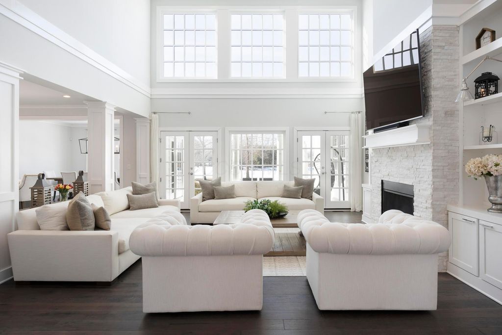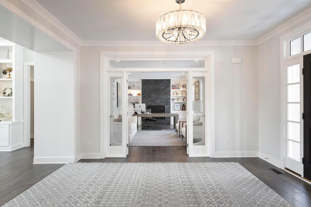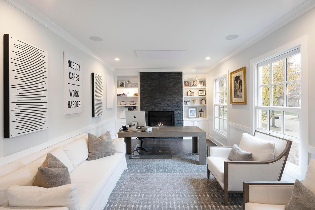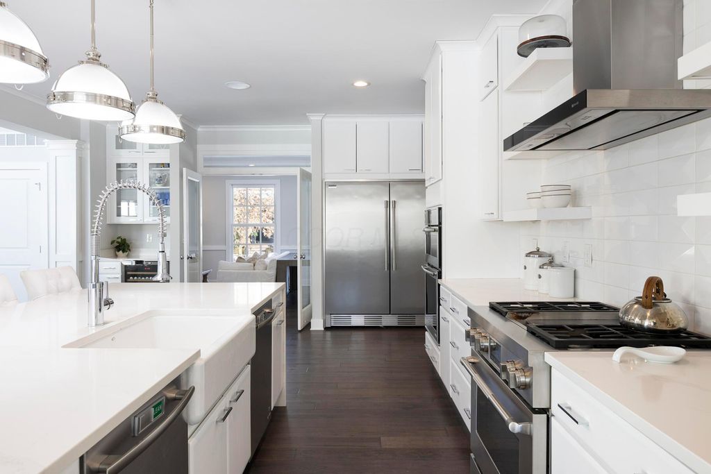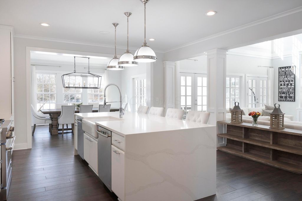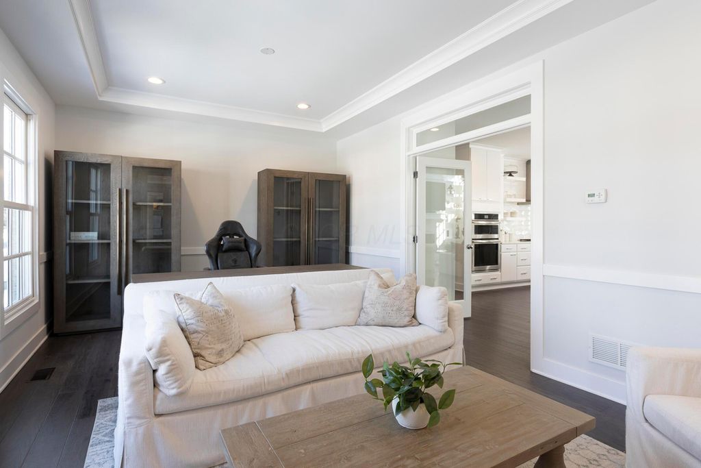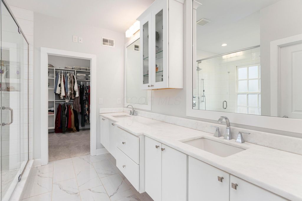 Overlooking the 7th fairway of New Albany Country Club in Ebrington, this 6,558 square foot California inspired home offers six bedrooms and six and a half baths across three levels of finely appointed living space. The foyer opens to two home offices, one with a gas fireplace, leading to a great room with soaring ceilings, a second fireplace, and expansive windows framing sweeping golf course views. Hardwood floors flow throughout the main level. The gourmet kitchen features a custom granite waterfall island with bar seating, two dishwashers, large side-by-side refrigerator, wine fridge, walk-in pantry, dining room, and a flex study area off from the kitchen. The main-level primary suite is a private retreat, featuring a wet room with a freestanding tub and walk-in shower, dual vanity, and a spacious walk-in closet. Mudroom with locker-style cubbies, first-floor laundry, and half bath complete the level. Four bedrooms occupy the second level, two with private baths and two sharing a Jack and Jill. All are appointed with walk-in closets and generously proportioned layouts. The finished lower level offers a large recreation area, kitchenette with refrigerator, sink, and dishwasher, a private sixth-bedroom suite with ensuite bath, and a second full bath. Outdoors, a covered patio, stone terrace, firepit, and expansive backyard create an inviting, private setting ideal for relaxing or entertaining while enjoying panoramic fairway views. A three-car side-load garage completes the home. Updates include conversion of the loft into a fifth bedroom with full bath (2018), finished basement with sixth bedroom and ensuite (2018), kitchen refresh with granite waterfall island (2018), and custom closet systems throughout each bedroom (2018).