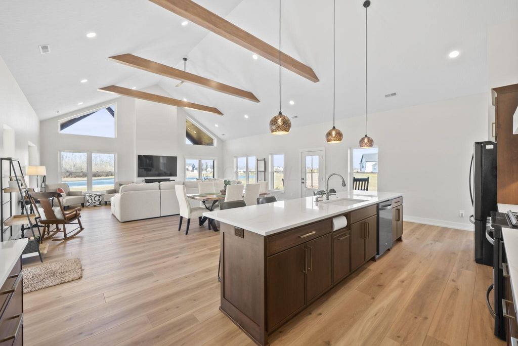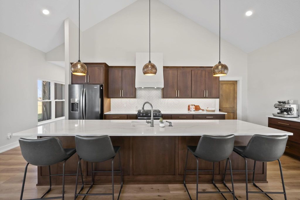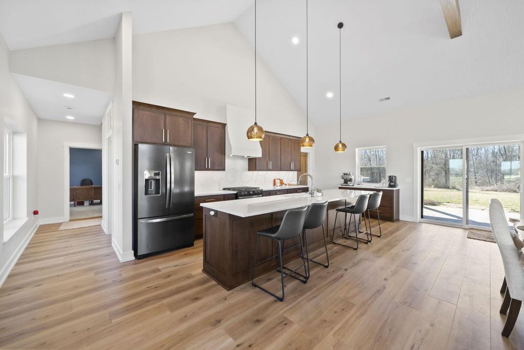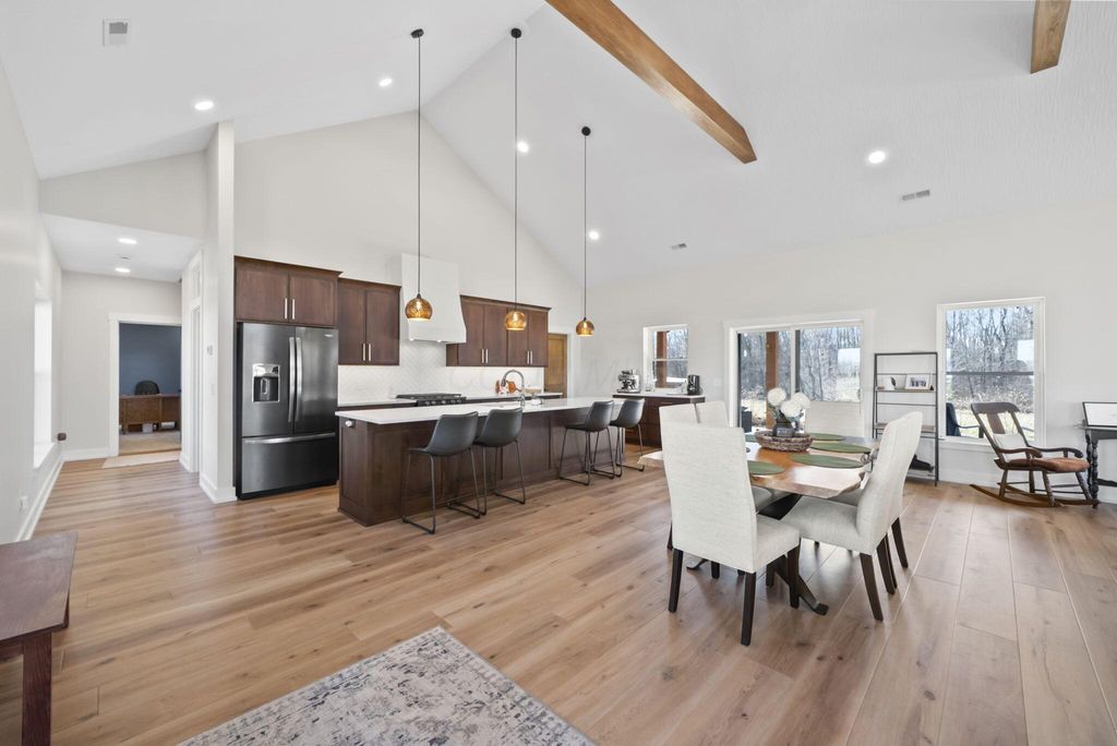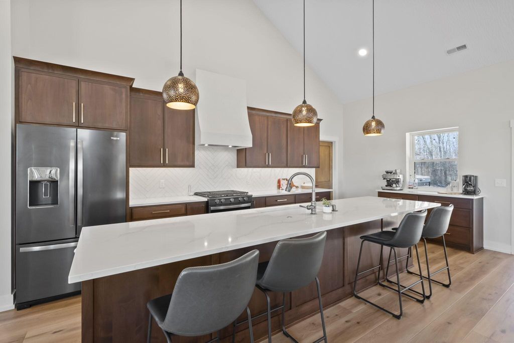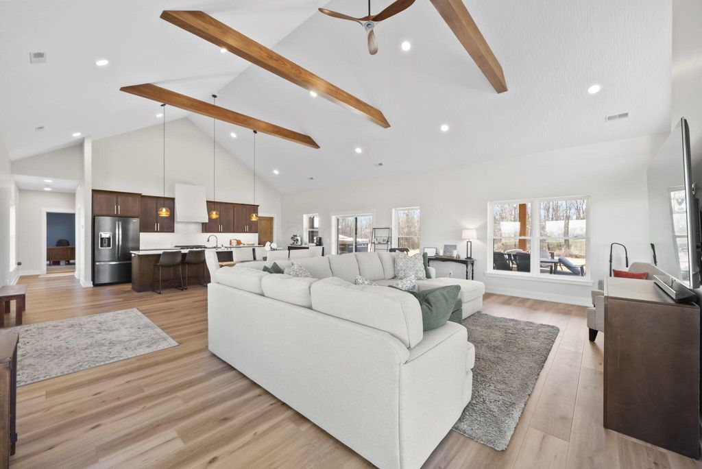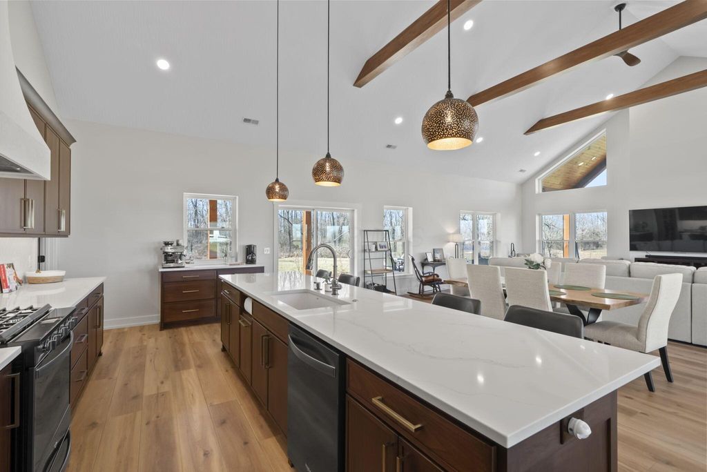 CUSTOM BUILT IN 2024 AND THOUGHTFULLY DESIGNED AS A PRIVATE RETREAT, THIS LIKE-NEW, ONE-OWNER HOME CAPTURES TRULY BREATHTAKING PANORAMIC VIEWS IN EVERY DIRECTION. A BEAUTIFUL WRAP-AROUND PORCH PROVIDES THE PERFECT PLACE TO RELAX AND TAKE IN THE SCENERY, SUNRISES, AND SUNSETS. SET AMONG WOODED TRAILS, FRESH LANDSCAPING, FRUIT TREES, AND A FULLY STOCKED POND WITH A PERMANENT EASEMENT, THE SETTING OFFERS PEACE, PRIVACY, AND SPACE TO UNWIND. INSIDE, EXCEPTIONAL CRAFTSMANSHIP SHINES THROUGH A STUNNING GOURMET KITCHEN DESIGNED TO IMPRESS. FEATURING BEAUTIFUL 42-INCH CABINETRY, A CUSTOM-CRAFTED HOOD, A MASSIVE ISLAND PERFECT FOR GATHERING AND ENTERTAINING, AND AN OVERSIZED WALK-IN PANTRY WITH A CONVENIENT PASS-THROUGH, THIS SPACE IS BOTH LUXURIOUS AND HIGHLY FUNCTIONAL. SOLID WOOD STAINED INTERIOR DOORS, CUSTOM CLOSET CABINETRY, AND NO WIRE SHELVING THROUGHOUT ELEVATE THE HOME WITH TIMELESS CHARACTER AND INTENTIONAL DESIGN. THE IMPRESSIVE 40X80 BARN EXPANDS THE PROPERTY'S POSSIBILITIES--ROUGH PLUMBED AND ROUGH WIRED WITH DRAIN LINES IN PLACE AND A PUMP ALREADY INSTALLED. WITH LOFT STORAGE AND FLEXIBLE LAYOUT OPTIONS, THERE IS POTENTIAL FOR UP TO FOUR ROOMS OR EVEN A MOTHER-IN-LAW SUITE, MAKING IT IDEAL FOR MULTI-GENERATIONAL LIVING, A HOME BUSINESS, OR FUTURE EXPANSION. THIS EXCEPTIONAL PROPERTY BLENDS MODERN COMFORT WITH SCENIC BEAUTY. COME SEE THIS ELEVATED RETREAT FOR YOURSELF.