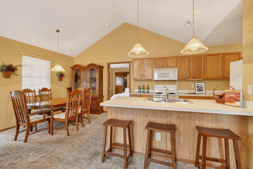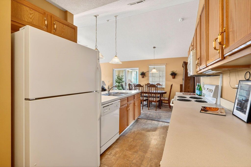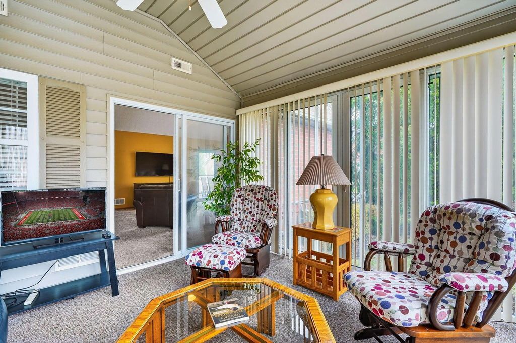 Showings Begin Friday March 13th. Professional photos coming soon! Welcome to this well cared for 2 bedroom, 2 full bath condominium with incredible proximity to shopping and restaurants while being tucked away with abundance of green space and mature trees. The setting is private and quiet, while offering convenience. Enjoy the fenced patio space. Open and spacious, this condo offers vaulted great room, large kitchen with breakfast bar and dedicated eating space. Four seasons room offers additional square footage and living space year round. Primary suite is large enough to accommodate a king size bed and large walk in closet. Second bedroom with plenty of closet space, adjoins the second full bath. Laundry room, equipped with washer and dryer is located in the mechanical room and is out of the way. Large oversized 2 car garage with additional storage space rounds off this condominium. Roof date 2020.