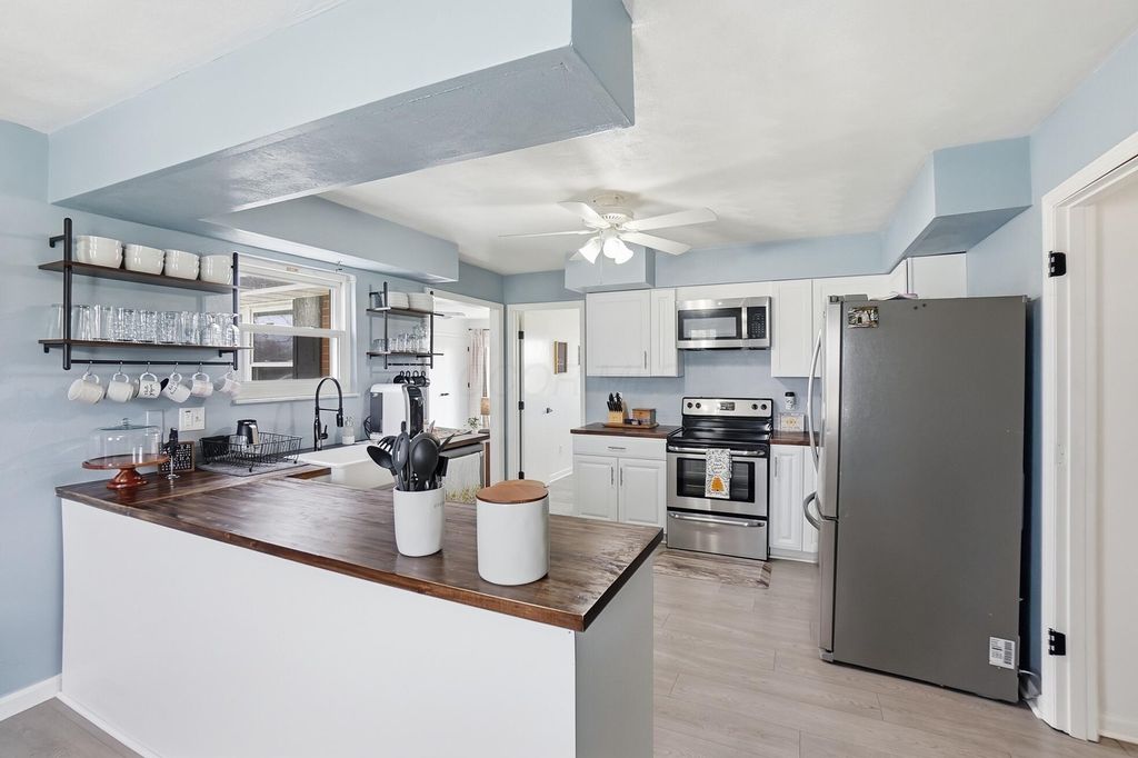 Updated Brick Cape Cod on 1.22 Acres! 5 bdrms (1st floor primary or 1 very large room upstairs could be primary) & 2 full bthrms (1 up & 1 first floor). Open Living Room w/ slider doors to beautiful back yard & is open to Dining Room. Kitchen is massive w/ room for expansion w/Eat In Kitchen, all new stainless steel appliances & butcher block countertops. Family Room has wood burning fireplace & slider doors to back yard. Patio & Fully fenced in back yard! Move In Ready Home w/ opportunity to still make your own! 4 Car Detached Garage! (1200 sq feet of space!) 2024 electric box in house & garage. Roof/ Gutters 2022 Gutter Guards & Downspouts 2023. 2024 All New LVP Flooring throughout home.