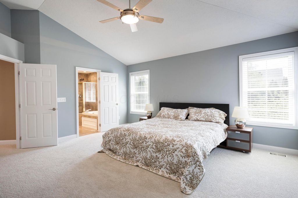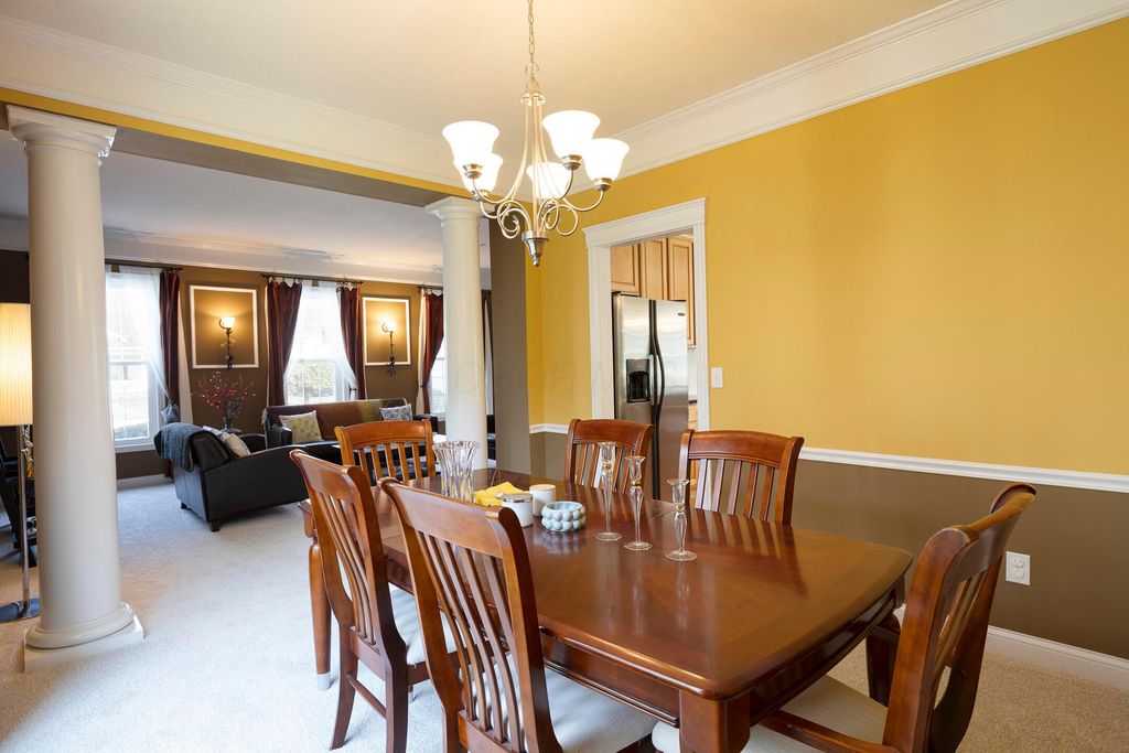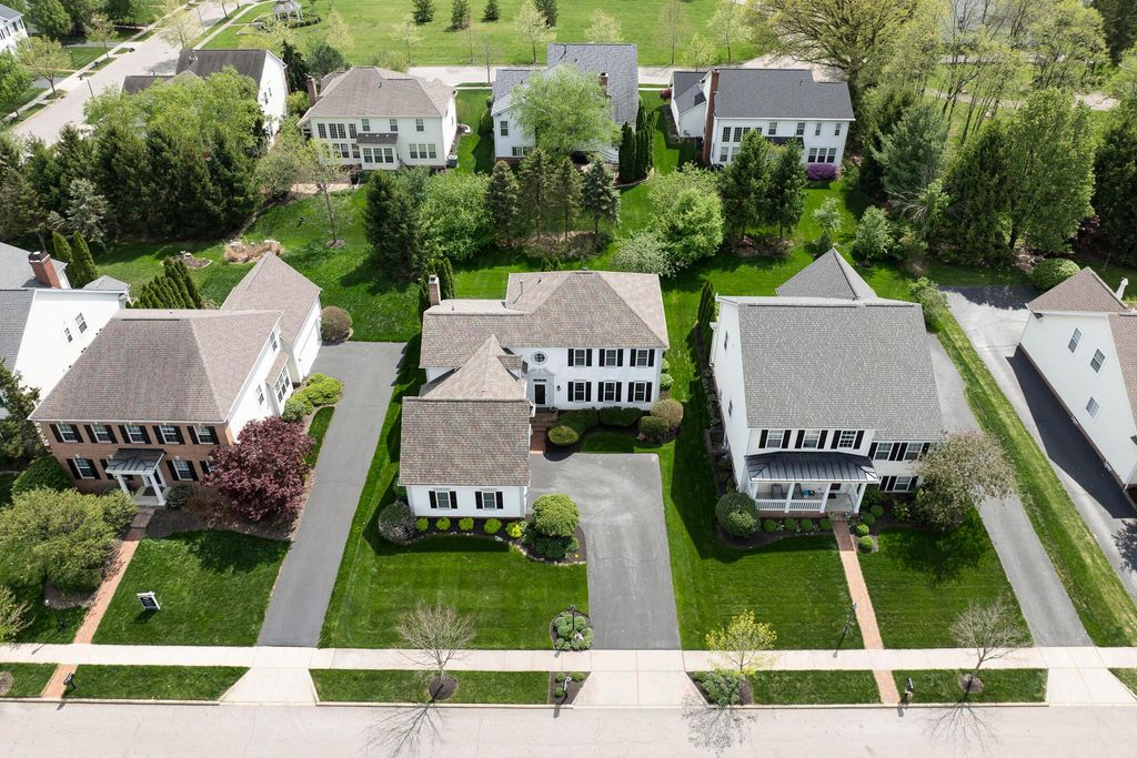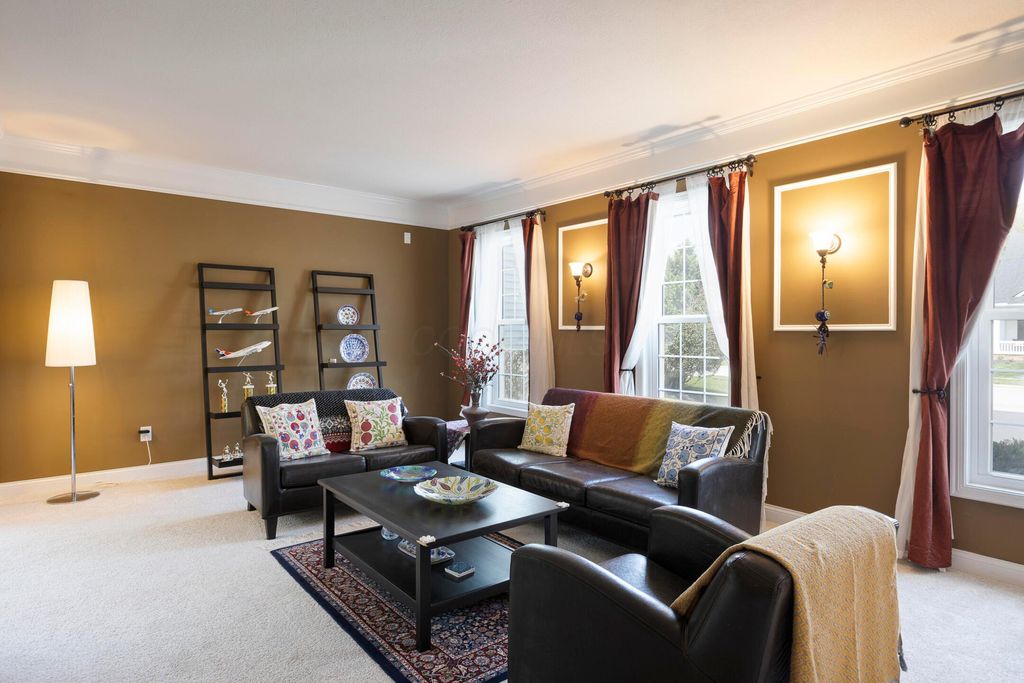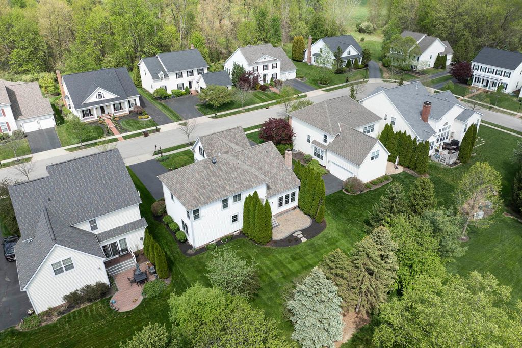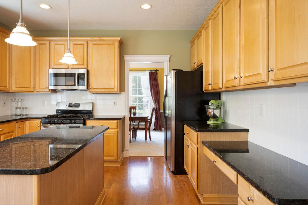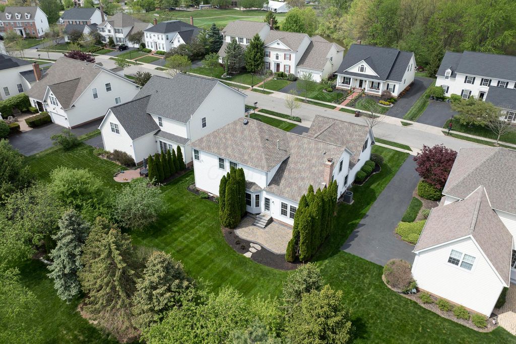 Four-bedroom, 2.5-bath home with 3,189 square feet, close to New Albany Links Golf Club and nearby green space, all within the New Albany School District. The main level offers a functional, open layout with hardwood floors, a two-story great room with gas log fireplace, and a second-floor overlook. The kitchen features granite countertops, maple cabinetry, a center island, stainless steel appliances with gas range, eat in space with direct access to the paver patio, and a formal dining room. A first-floor office or flex space and laundry add everyday convenience. Upstairs, the primary suite includes vaulted ceilings, a walk-in closet, and an updated bath with double vanity and separate shower. Three additional bedrooms or a flexible bonus room complete the second level. The backyard is designed for privacy with a paver patio, defined seating area, and mature evergreen screening, opening to green space beyond. Full basement offers storage or future finishing potential. Two-car attached garage. Recent updates include new carpet, windows, and microwave (2025), foam-insulated garage doors and exterior paint (2024), updated toilets (2023), patio (2022), Trane HVAC, water heater, and sump pump (2021), washer, dryer, and dishwasher (2020), and roof (2018).