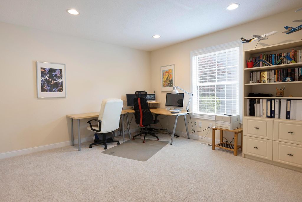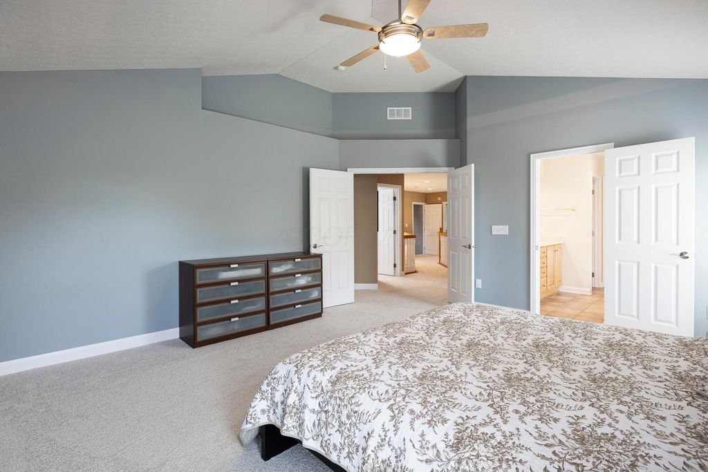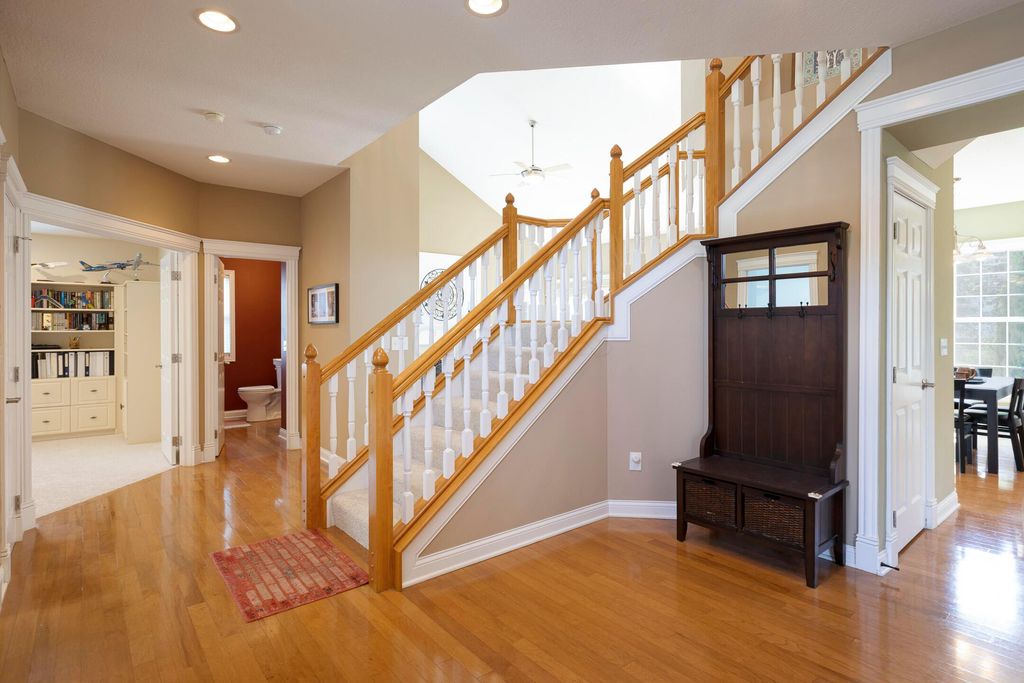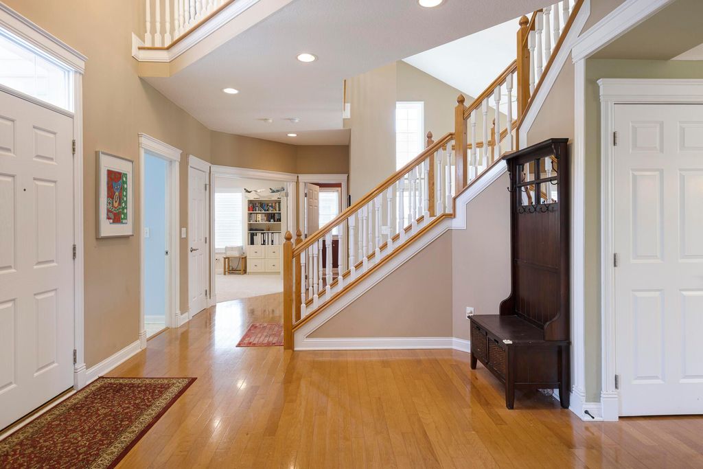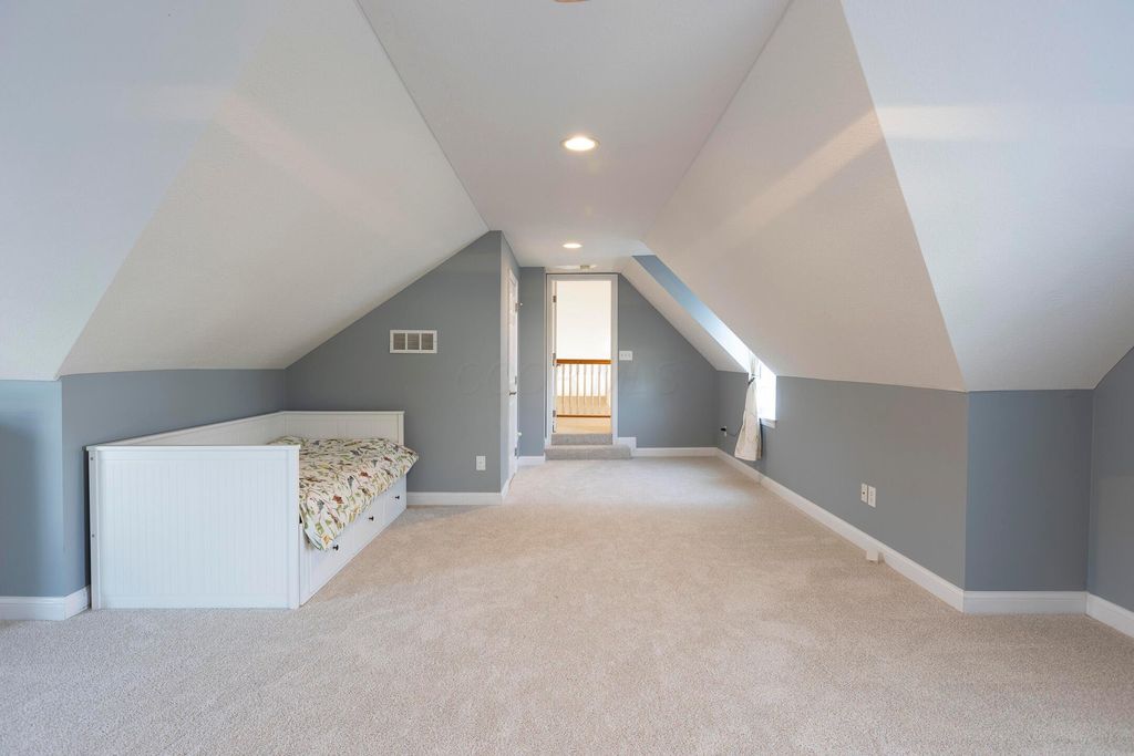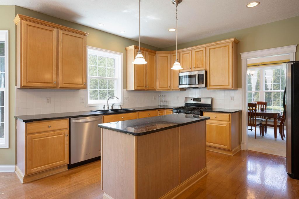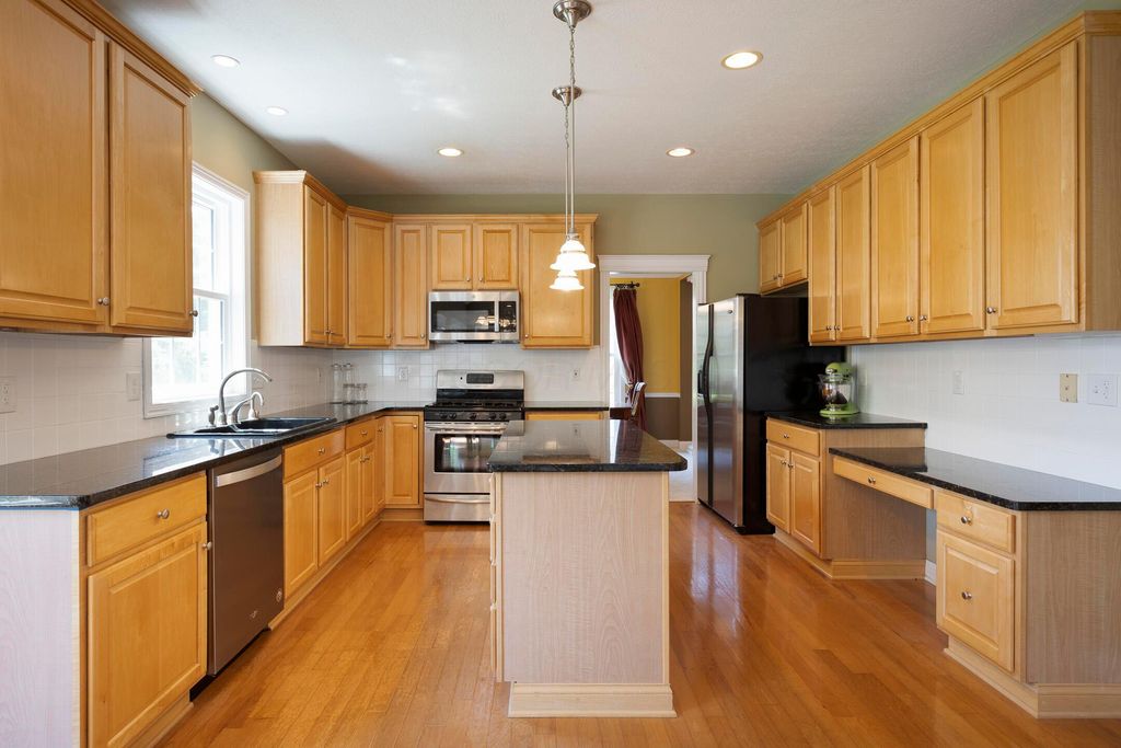 Four-bedroom, 2.5-bath home with 3,189 square feet, close to New Albany Links Golf Club and nearby green space, all within the New Albany School District. The main level offers a functional, open layout with hardwood floors, a two-story great room with gas log fireplace, and a second-floor overlook. The kitchen features granite countertops, maple cabinetry, a center island, stainless steel appliances with gas range, eat in space with direct access to the paver patio, and a formal dining room. A first-floor office or flex space and laundry add everyday convenience. Upstairs, the primary suite includes vaulted ceilings, a walk-in closet, and an updated bath with double vanity and separate shower. Three additional bedrooms or a flexible bonus room complete the second level. The backyard is designed for privacy with a paver patio, defined seating area, and mature evergreen screening, opening to green space beyond. Full basement offers storage or future finishing potential. Two-car attached garage. Recent updates include new carpet, windows, and microwave (2025), foam-insulated garage doors and exterior paint (2024), updated toilets (2023), patio (2022), Trane HVAC, water heater, and sump pump (2021), washer, dryer, and dishwasher (2020), and roof (2018).