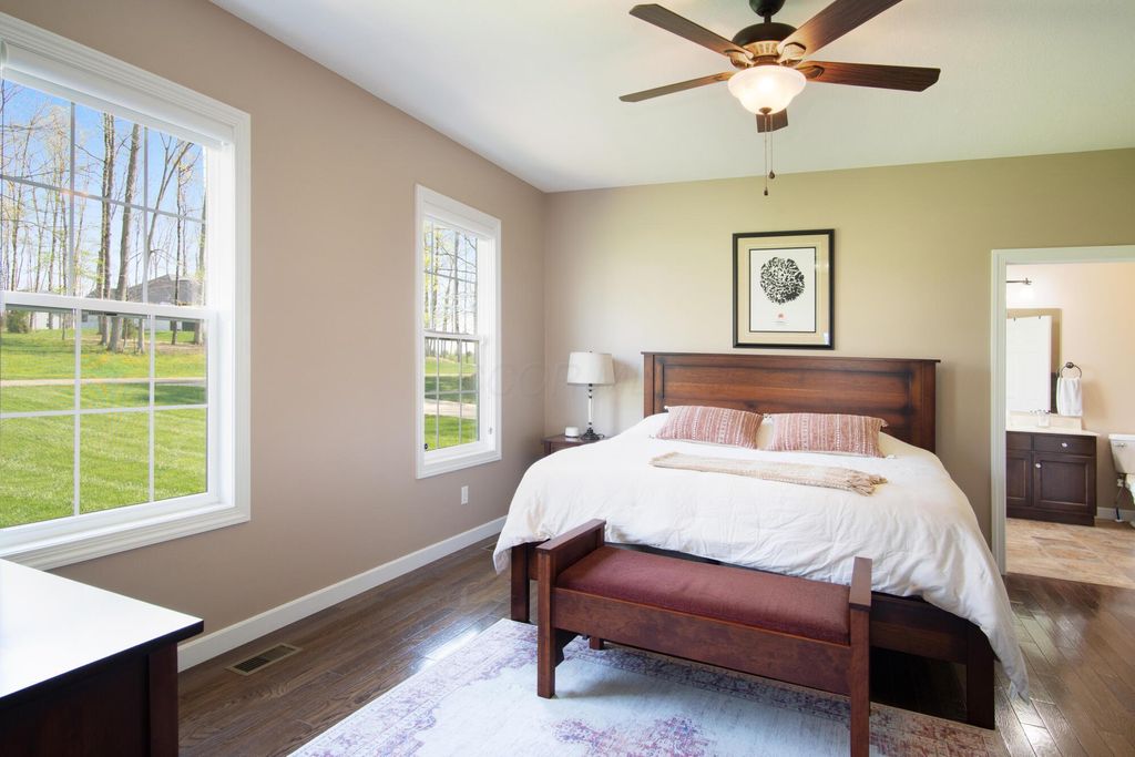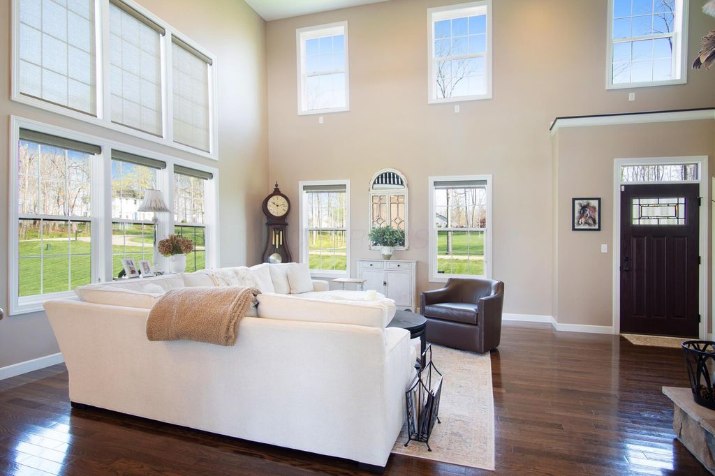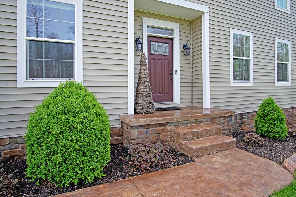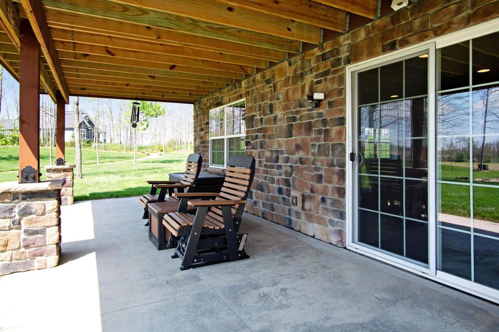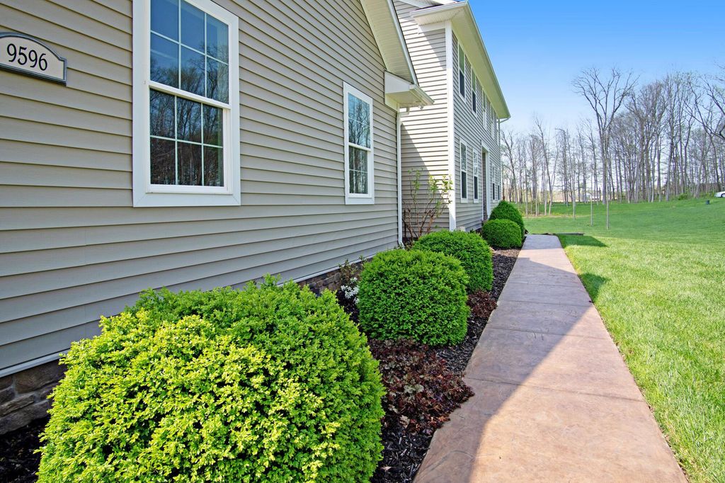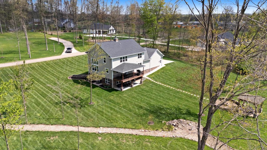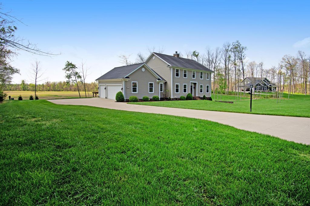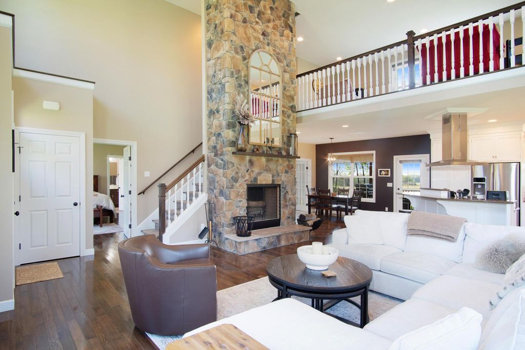 Stunning 3BR/3BA colonial on 1.43 private acres in sought-after Woodbridge Subdivision -- no detail overlooked, no expense spared. Situated on a quiet cul-de-sac with open countryside views in every direction. 3,498 total sq ft across 3 levels: 1,572 main floor, 578 upper, and a 1,348 sq ft finished walkout basement that rivals any above-grade living space in this price range. The soaring 2-story great room features gleaming hardwood floors, a wall of windows flooding the space with natural light, and a dramatic floor-to-ceiling natural stone wood-burning fireplace. Chef's kitchen delivers granite countertops, white shaker cabinetry to the ceiling, stainless steel chimney hood, center island with seating, and glass-front uppers -- open to the great room and the views beyond. Main-floor primary suite offers dual walk-in closets and a luxurious 8x15 private bath. Upper level adds 2 generous bedrooms, full bath, open family room loft with gas fireplace, and stunning open-to-below views. Finished walkout basement boasts a massive recreation room with gas fireplace, hardwood-style floors, home office area, full bath, and direct outdoor access. Covered composite deck with cedar tongue-and-groove ceiling overlooks a professionally landscaped backyard retreat featuring a pergola, stone paver patio, built-in fire pit, and winding stone path. 3-car attached garage with single and double doors. Home features 3 fireplaces, 2 gas and one wood-burner on main floor. Fredericktown LSD. Immaculate, move-in ready -- this home lives as beautifully as it photographs.